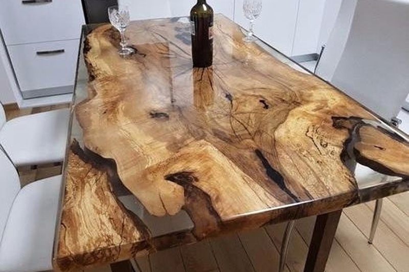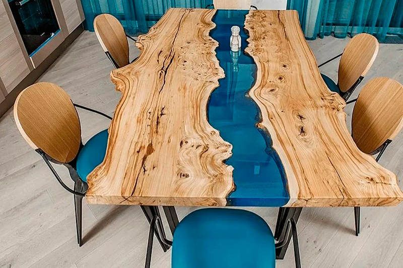 Stoly z pryskyřice jsou zřejmě tím nejnáročnějším dílem, které lze z pryskyřice vyrobit. Zázemí, zkušenosti, vybavení a větší investice, to vše bychom měli brát v úvahu, než se do takové tvorby pustíme. Jak vyrobit stůl z pryskyřice? Na jídelní stůl z pryskyřicí budeme volit speciální pryskyřice - truhlářská pryskyřice. Ta zpravidla vytvrzuje i několik dní, je řídká a je certifikovaná pro styk s potravinami (epoxidová pryskyřice potraviny). Další její technickou vlastností by měla být odolnost proti žloutnutí. Zahájení práce začíná u výběru dřeva (např. atypické fošny) a výroby formy. Jídelní stůl s pryskyřicí může kombinovat dřevo a pigmentovanou pryskyřici metalickými prášky, pryskyřice může být probarvena průhlednými barvami a nebo může být pryskyřice zcela čirá a dokonale průhledná.