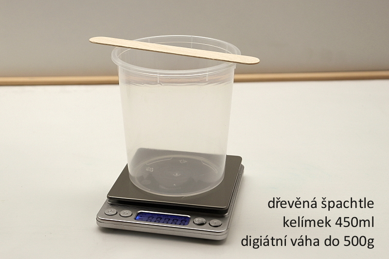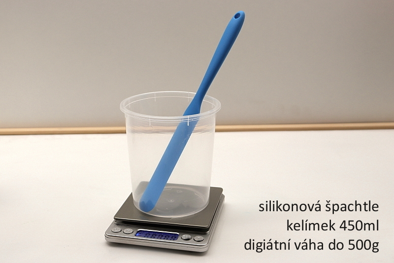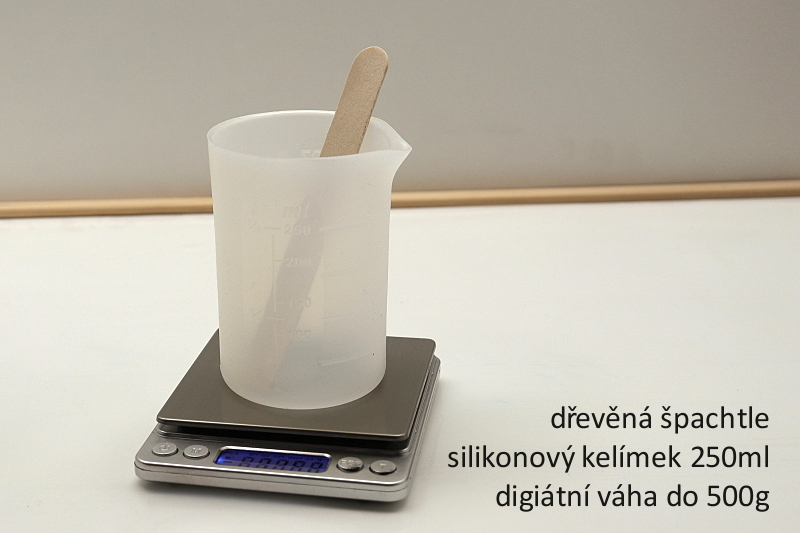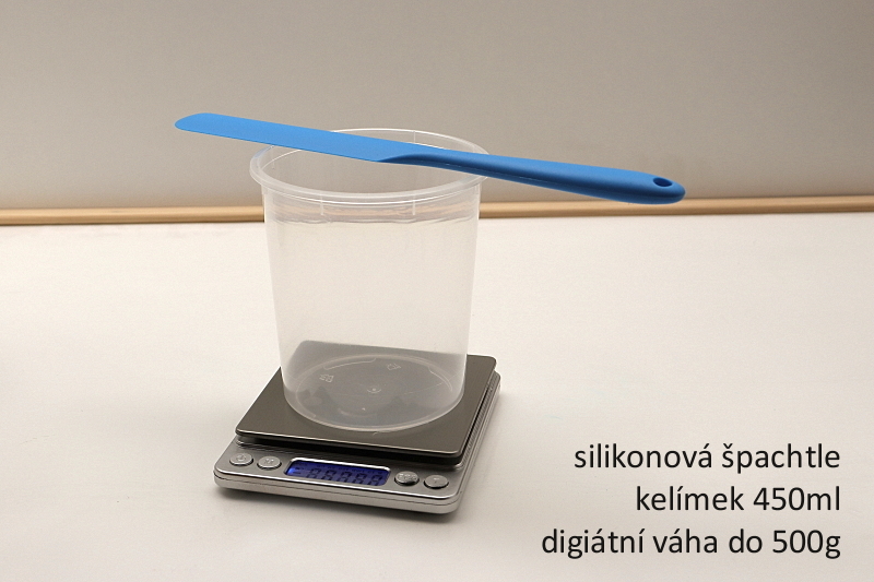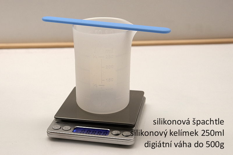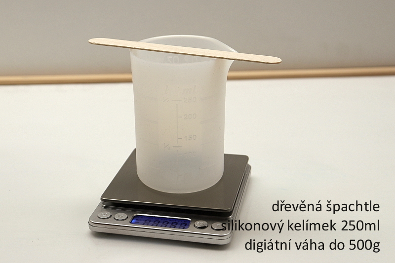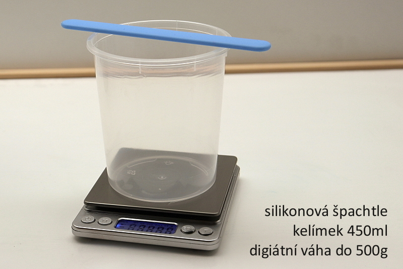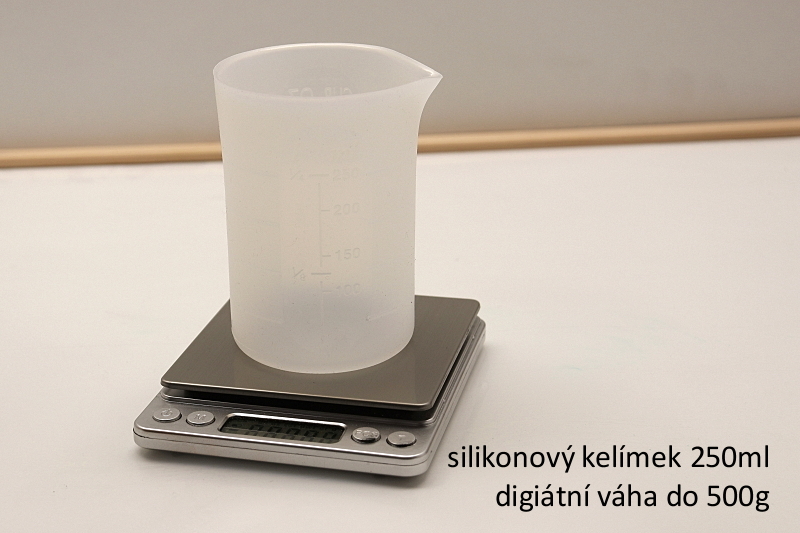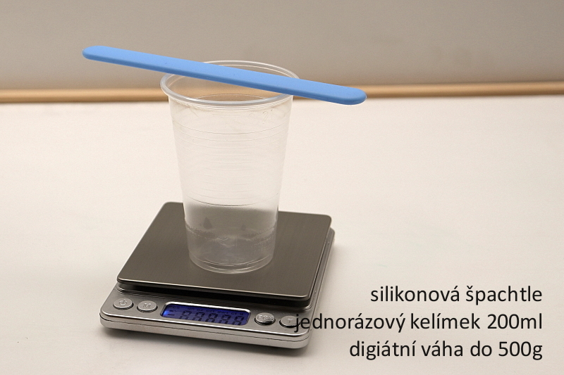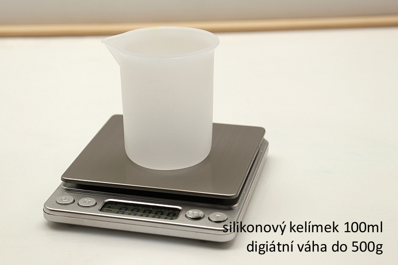 Na každé pryskyřici podle typu jejího použití najdete hmotnostní mísící poměr. Tento mísící poměr uvádí, jaké množství složky A a složky B je potřeba navážit. Zapneme váhu (počkáme až se váha vynuluje) a na ní si připravíme vhodný kelímek pro promíchání obou složek. Nejprve do kelímku nalijeme složku A, váhu vynulujeme tlačítkem TARE a po té přidáme složku B. Máme-li pryskyřici, která se mísí v poměru 3:1, pak víme, že k její přípravě je potřeba 3g složky A a 1g složky B. Dbejte na pokud možno přesném navážení obou složek. Nikdy licí pryskyřici nepřipravujte objemovým poměrem.