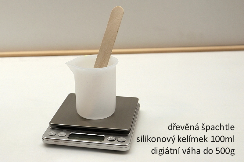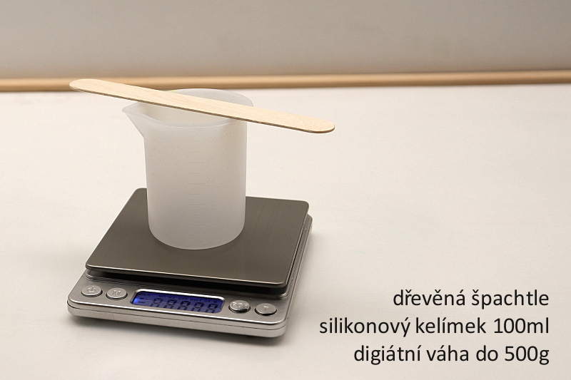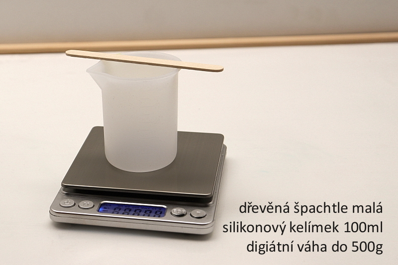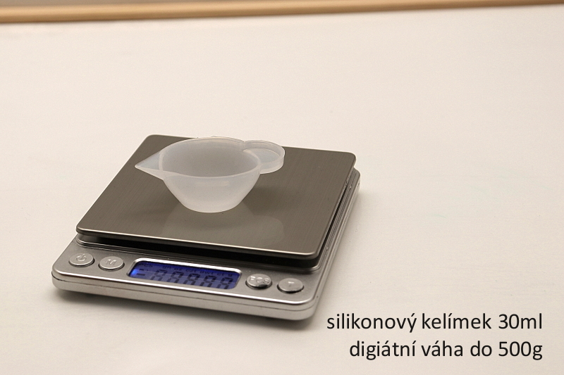 Pro správnou přípravu licí pryskyřice se vybavte kvalitní digitální váhou. Pro přípravu a smíchání menšího množství pryskyřice nedoporučujeme kuchyňské váhy. Menší množství obou složek, například pro výrobu šperků nebo podtácků z pryskyřice je vhodnější šperkařská digitální váha s váživostí do 500g a přesností alespoň 0,1g. Foto: digitální váha do 500g s přesností vážení 0,01g.