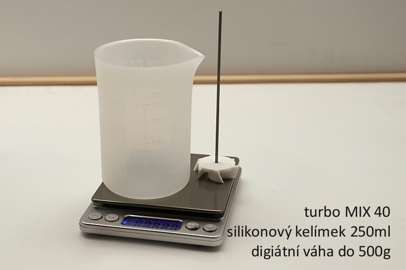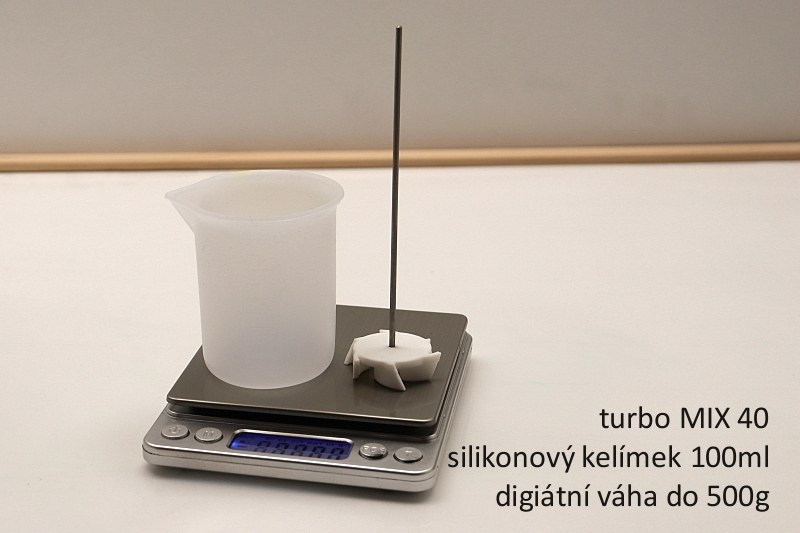 Dalším krokem je důkladné promíchání připravené složky A a B. Můžete míchat ručně nebo strojně. Pro menší množství můžeme zvolit menší dřevěné špachtle až po větší rozměr špachtle nebo silikonové špachtle, které opět po vytvrzení zbytků pryskyřice snadno očistíme. Obě složky pryskyřice mícháme pomalu po dobu 3 - 5 minut. Pomalu mícháme proto, abychom licí pryskyřici zbytečně nezavzdušnili (bublinky v pryskyřici). V průběhu míchání odmíchávejte ode dna a občas špachtlí odmíchejte od stěn kelímku. Složka A je hustější než složka B a je potřeba abyste složku A, která po nalití do kelímku ulpí na stěnách kelímku, odmíchali do celého objemu pryskyřice. Další možností jak dokonale promíchat obě složky pryskyřice je použití míchadla pro strojní míchání. I zde platí, že velikost míchadla zvolíme podle velikosti kelímku, a že mícháme pomalými otáčkami, abychom pryskyřici nezavzdušnili. Galerie různých velikostí a typů míchátek.