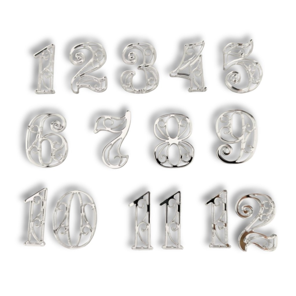 Jde o klasické arabské (latin) číslice, které jsou na první pohled dobře čitelné a hodí se jak k minimalistickým, tak k výrazněji zdobeným hodinovým projektům z epoxidové pryskyřice i dřeva.