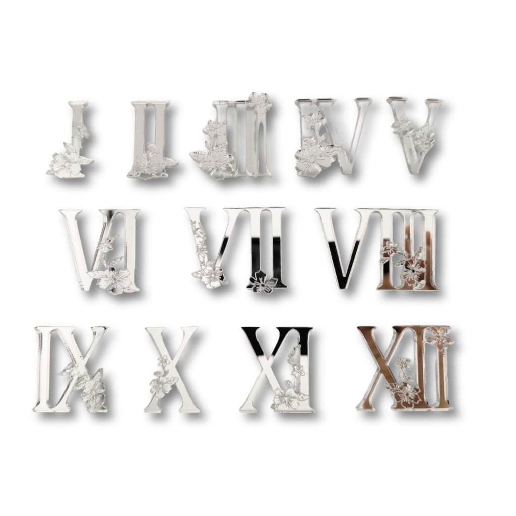 Zrcadlová čísla na hodiny – Římské květinové stříbrné 40 mm – Květa240