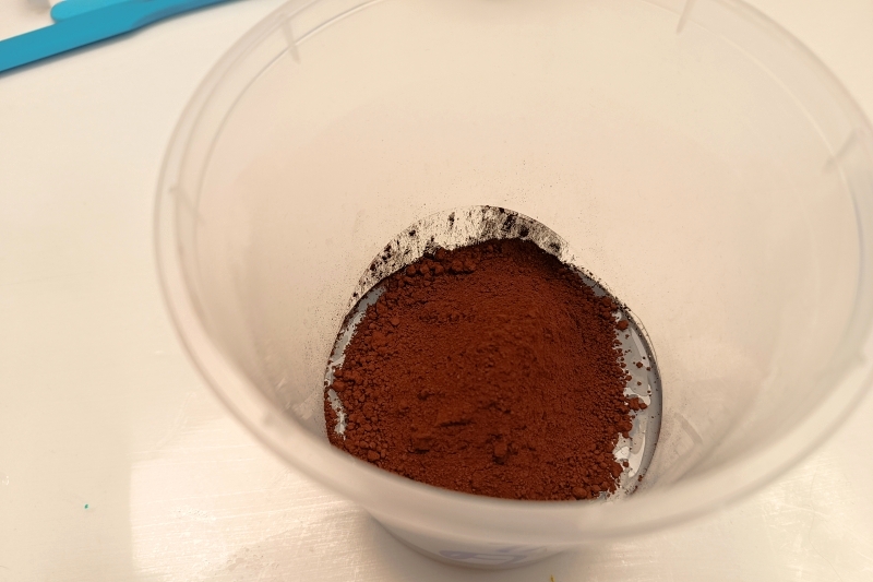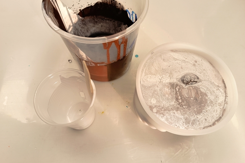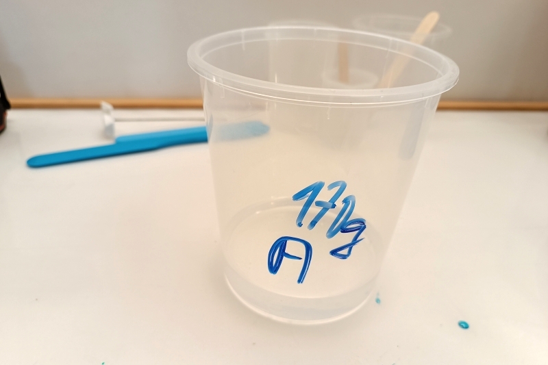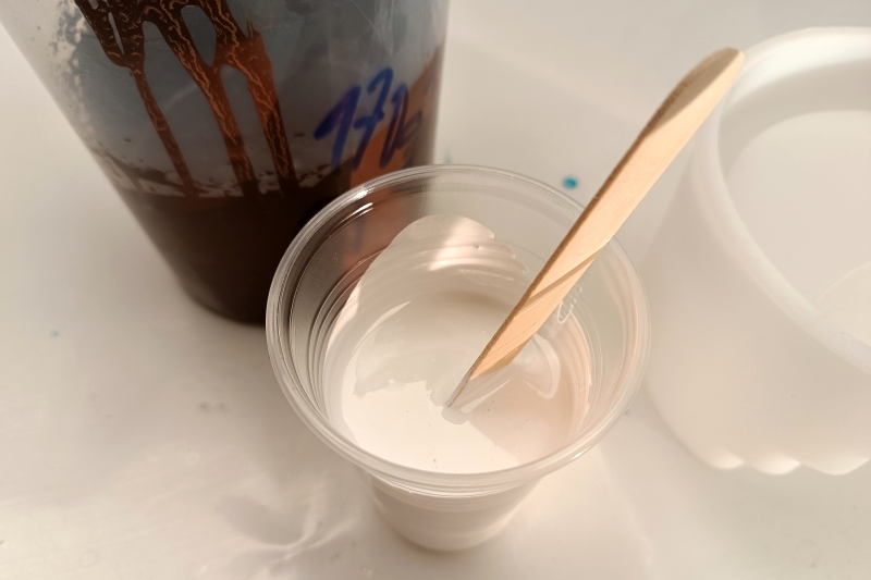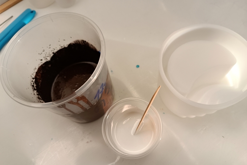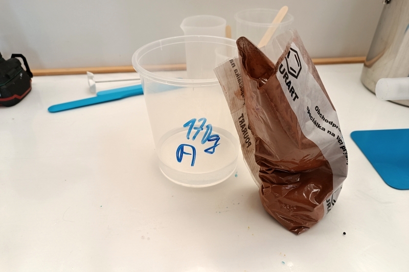 Vedle naší směsi jsme si připravili 100g pryskyřice (A+B) s přidáním bílé barvy. Tu použijeme pro melírování hnědé moučky.