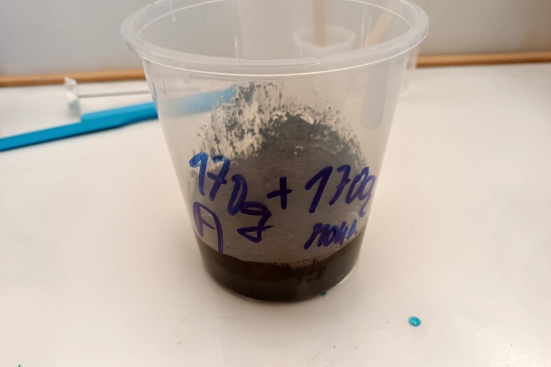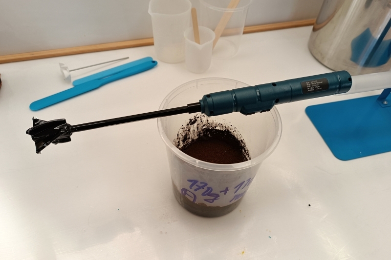 Do většího kelímku si navážíme 170g licí pryskyřice a to pouze složku A. Na hladinu nasypeme 170g hnědé mramorové moučky, kelímek zakryjeme a necháme několik hodin stát. Mramorová moučka bude postupně nasákat a klesat ke dnu. Po úplném smočení mramorové moučky získáme směs bez bublinek. Mramorová moučka obsahuje vzduch. Kdybychom ji ihned po nasypání do pryskyřice zamíchali, zanesli bychom do směsi mnoho vzduchu - vzduchových bublinek. Dále přidáme správné množství složky B (tvrdidla) a důkladně promícháme. Zde doporučujeme použít strojní míchání. Směs je hustější a ruční míchání nemusí být vždy tak důkladné. Tím máme směs připravenou pro další práci.