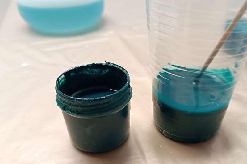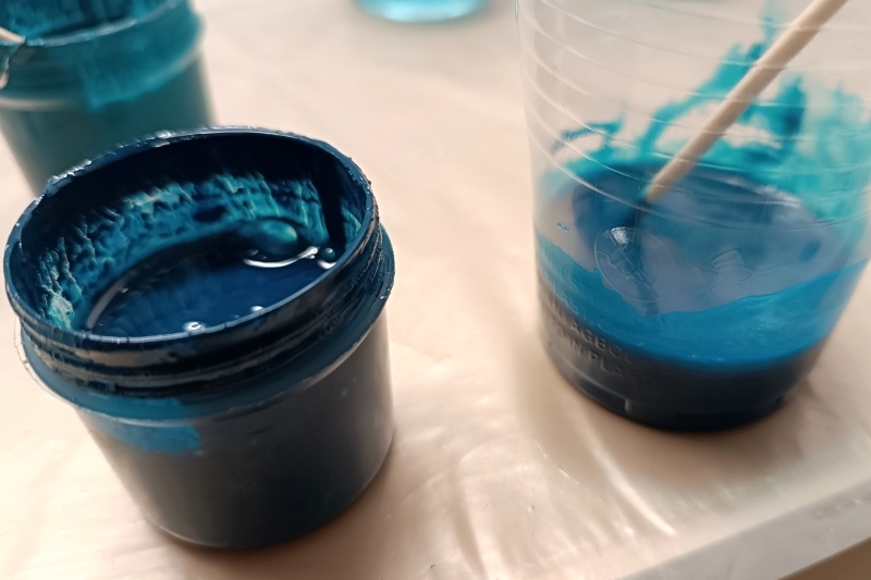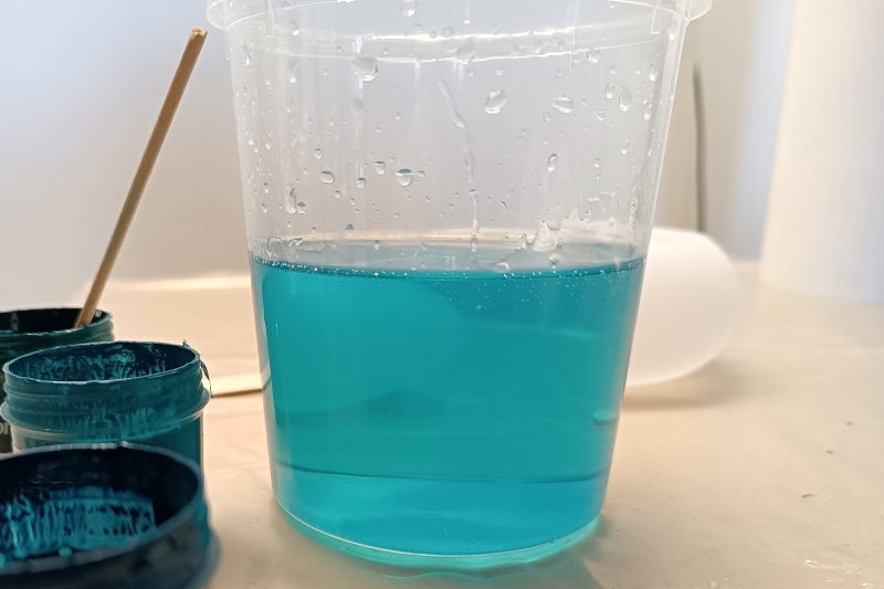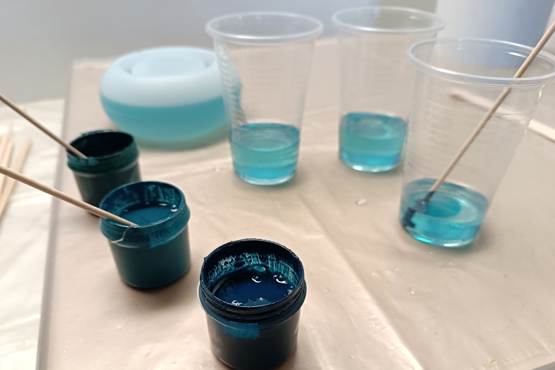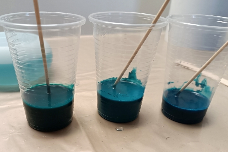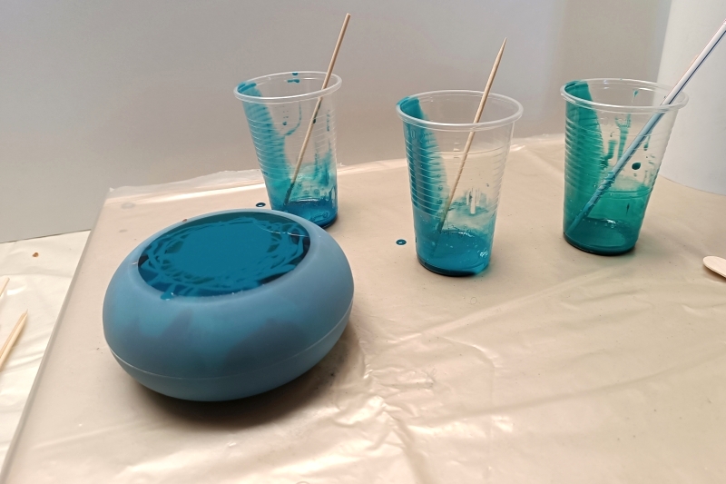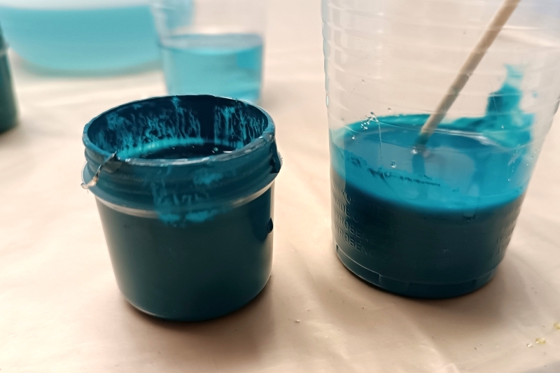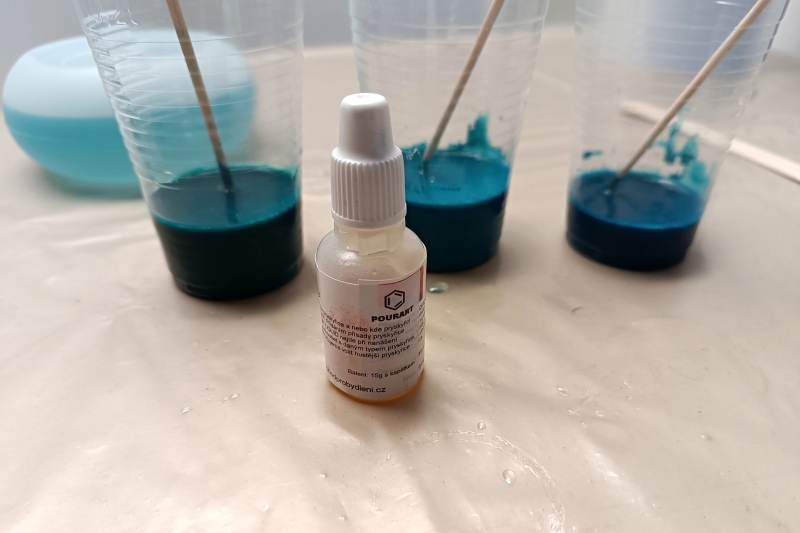 5. Barvení pryskyřice. Z celé váhy připravené pryskyřice jsme odebrali do třech kelímků přibližně po 50 gramech a do zbývající větší části jsme přidali barvu do pryskyřice (jednu kapku), tyrkysovou, pro průhledné probarvení. Do zbývajících 3 částí (kelímků) jsme vybrali pigment do pryskyřice (pasta do pryskyřice) v tyrkysových odstínech. Pasty jsme přidali více, aby výsledný efekt byl plně a sytě probarvený. Dále jsme do našich 3 kelímků přidali přísadu pro oddělení barev NON LIQUID (dávkován je 1% - přidali jsme 5 kapek) a vše důkladně a pomalu promíchali.