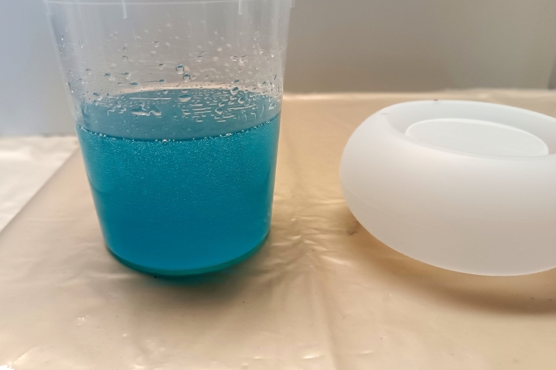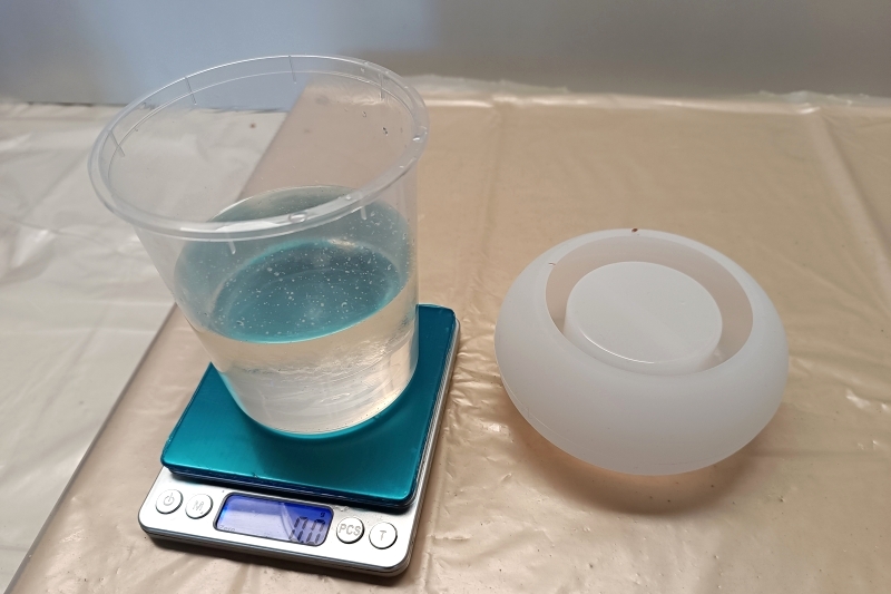 2. Pro výrobu našeho svícnu z pryskyřice jsme zvolili větší silikonovou formu. Její objem je 315ml. Abychom znali přibližnou spotřebu pryskyřice, nalili jsme do formy vodu a ty vylili zpět do odměrné nádoby. Formu jsme nechali před samotným litím pryskyřice důkladně vyschnout. Poznámka: protože je pryskyřice hustější než voda a připravujeme ji v gramech, je potřeba zjištěný objem formy vynásobit koeficientem 1,1.