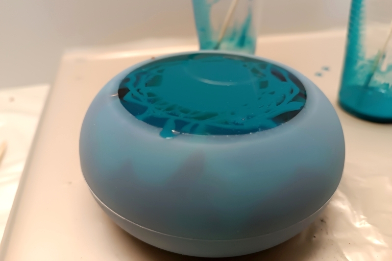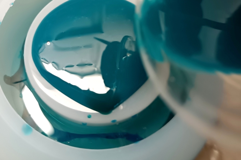 6. Zalití formy pryskyřicí. Největší část pryskyřice, lehce probarvenou do průhledné tyrkysové, jsme nalili do formy. Zbývající 3 kelímky se sytě probarvenou pastou a přísadou jsme nalili velmi pomalu do průhledné pryskyřice, aby se odstíny co nejméně promíchaly.
