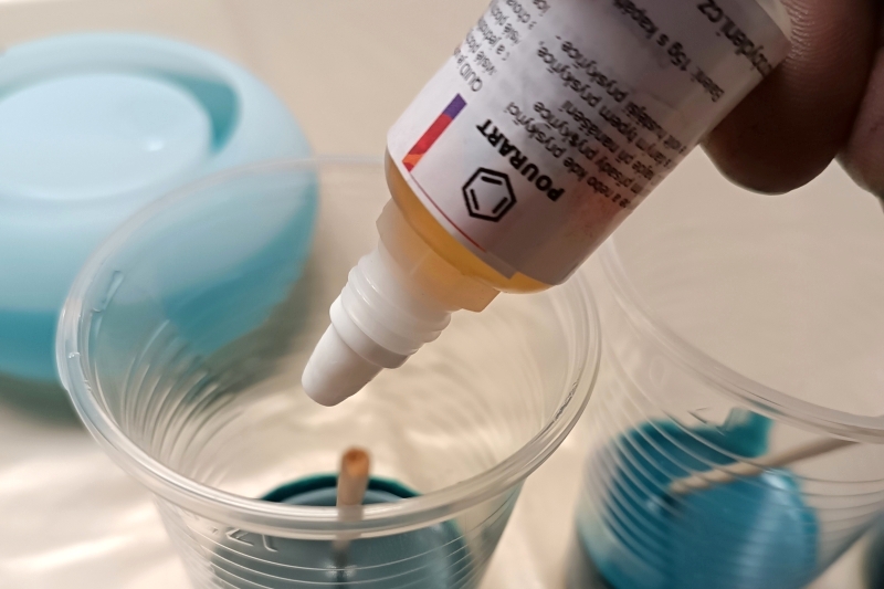 - Volba pryskyřice pro dekorace (řidší směs 30–50 mm) a pigmentace (koncentráty/pasty).