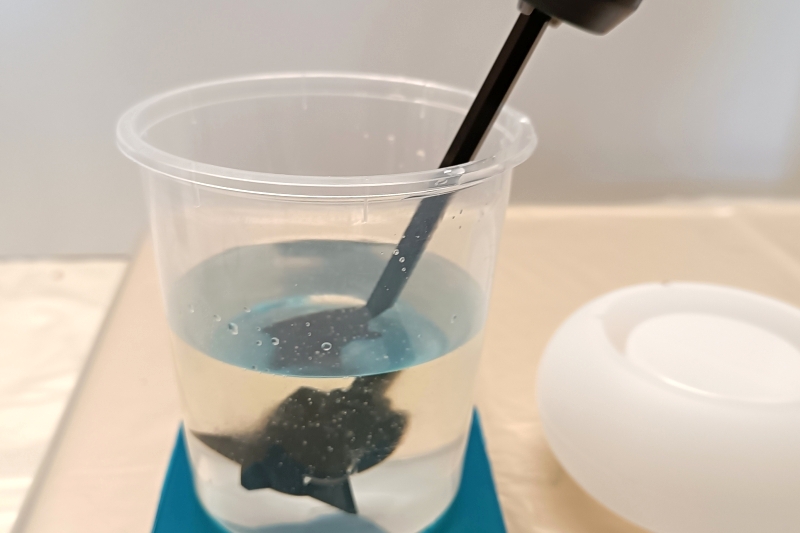 4. Příprava pryskyřice. Licí pryskyřici jsme připravili na digitální váze - odvážili jsme složku A a do ní jsme odvážili složku B (více o správné přípravě pryskyřice najdete v článku Jak pracovat s epoxidem) a obě složky jsme promíchali míchadlem upevněném v aku vrtačce. Na rozdíl od ručního míchání máme jistotu, že se obě složky dokonale promísí. Ti kdo jsou lépe vybavení, použijí pro vyčištění bublinek od pryskyřice vakuovou komoru. Níže na obrázku vidíte v jakém stavu je pryskyřice po míchání a jak je zbavená bublinek po odvzdušnění ve vakuové komoře.