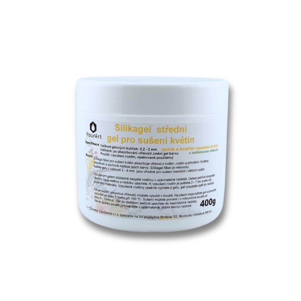 Medium Silica Gel – for drying flowers with moisture indicator 0.2–2 mm – 400 g is an effective drying agent designed especially for drying flowers and natural materials that you want to use further in decorations, arrangements, or for embedding in epoxy resin.