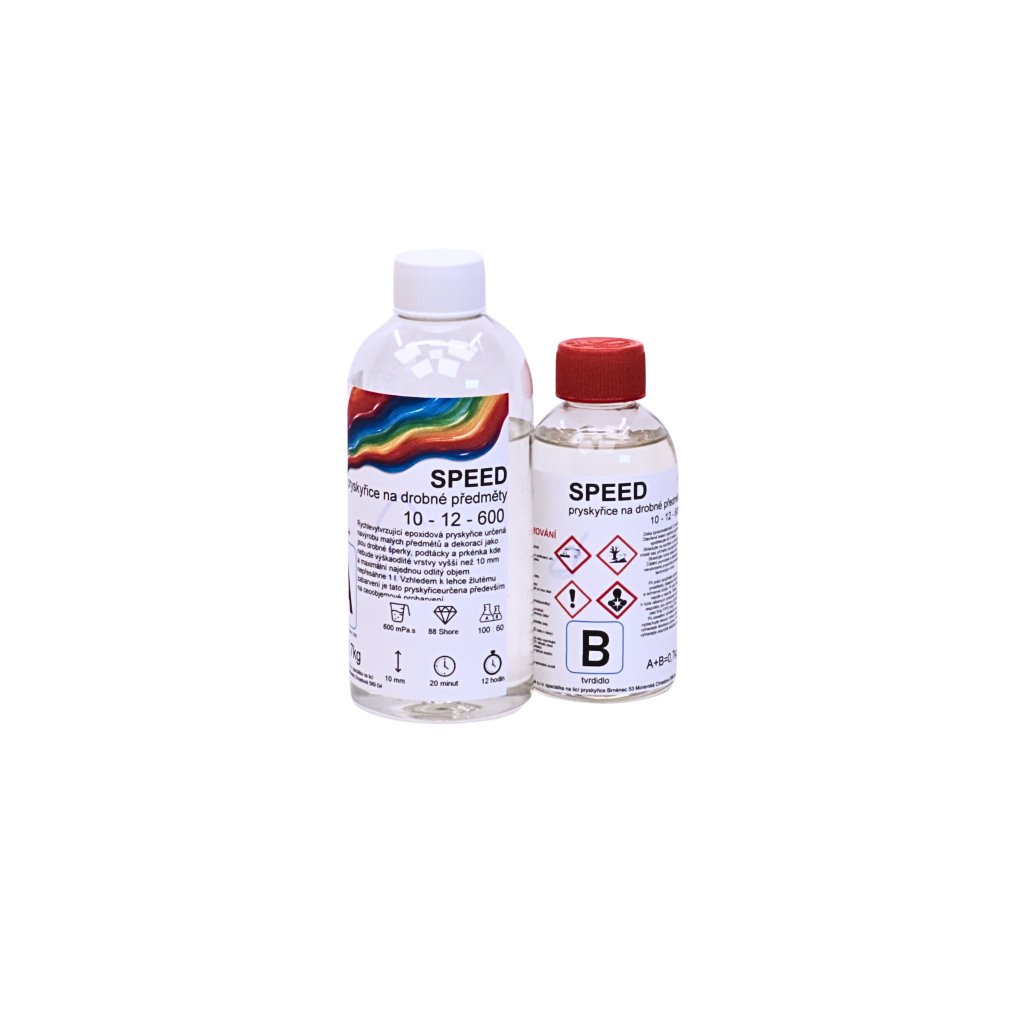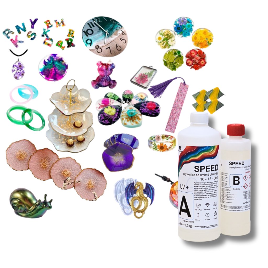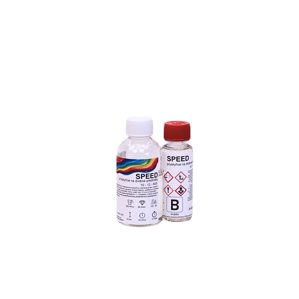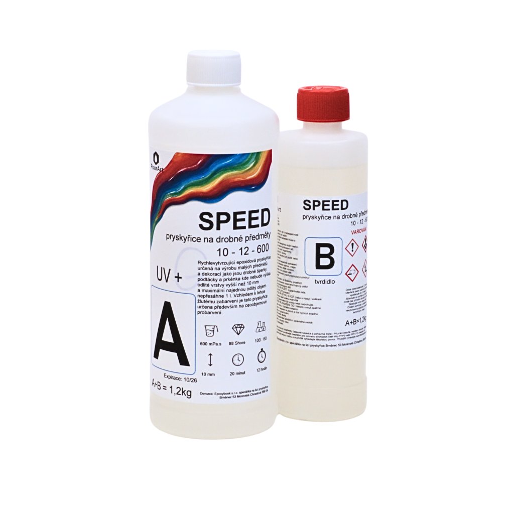 Licí epoxidová pryskyřice SPEED 10-12-600 UV+ je rychle tvrdnoucí dvousložková pryskyřice se zkrácenou dobou vytvrzení. Díky své řídké konzistenci výborně zateče do detailů, velmi dobře se odvzdušňuje a po vytvrzení vytváří dokonale lesklý a velmi tvrdý povrch. Má základní UV ochranu, proto se u čirých a silnějších odlitků může po čase projevit mírné žloutnutí – ideální je proto používat ji probarvenou.