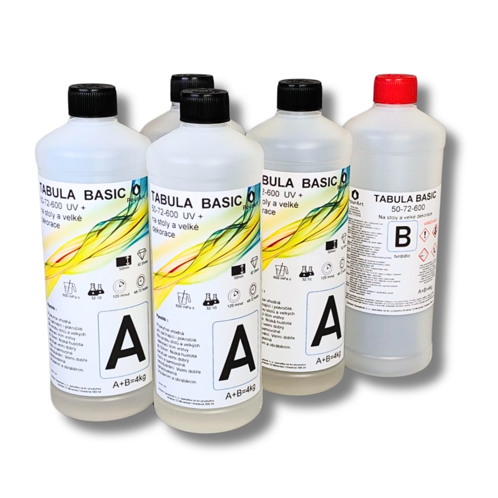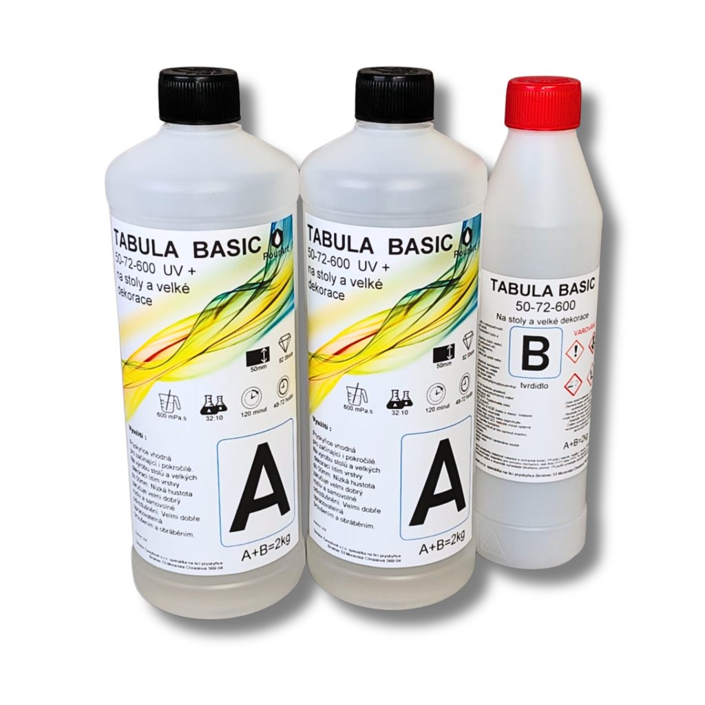 Pryskyřice na dřevo TABULA BASIC 50-72-600 UV+ je řídká epoxidová pryskyřice určená na výrobu stolů z pryskyřice a zalévání dřeva pryskyřicí.