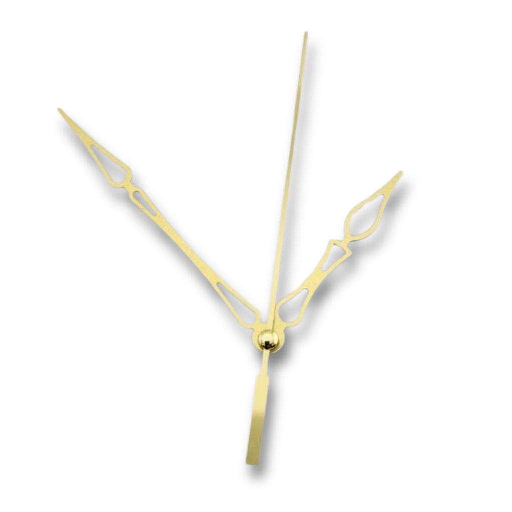 Hodinové ručičky kopinaté 2 – 85/64 – zlaté jsou štíhlé, ozdobné ručičky s kopinatým zakončením, které dodají vašim hodinám elegantní a lehce luxusní vzhled. Zlatá barva krásně vynikne na tmavých i světlých cifernících a sluší jak minimalistickým, tak bohatě zdobeným projektům.