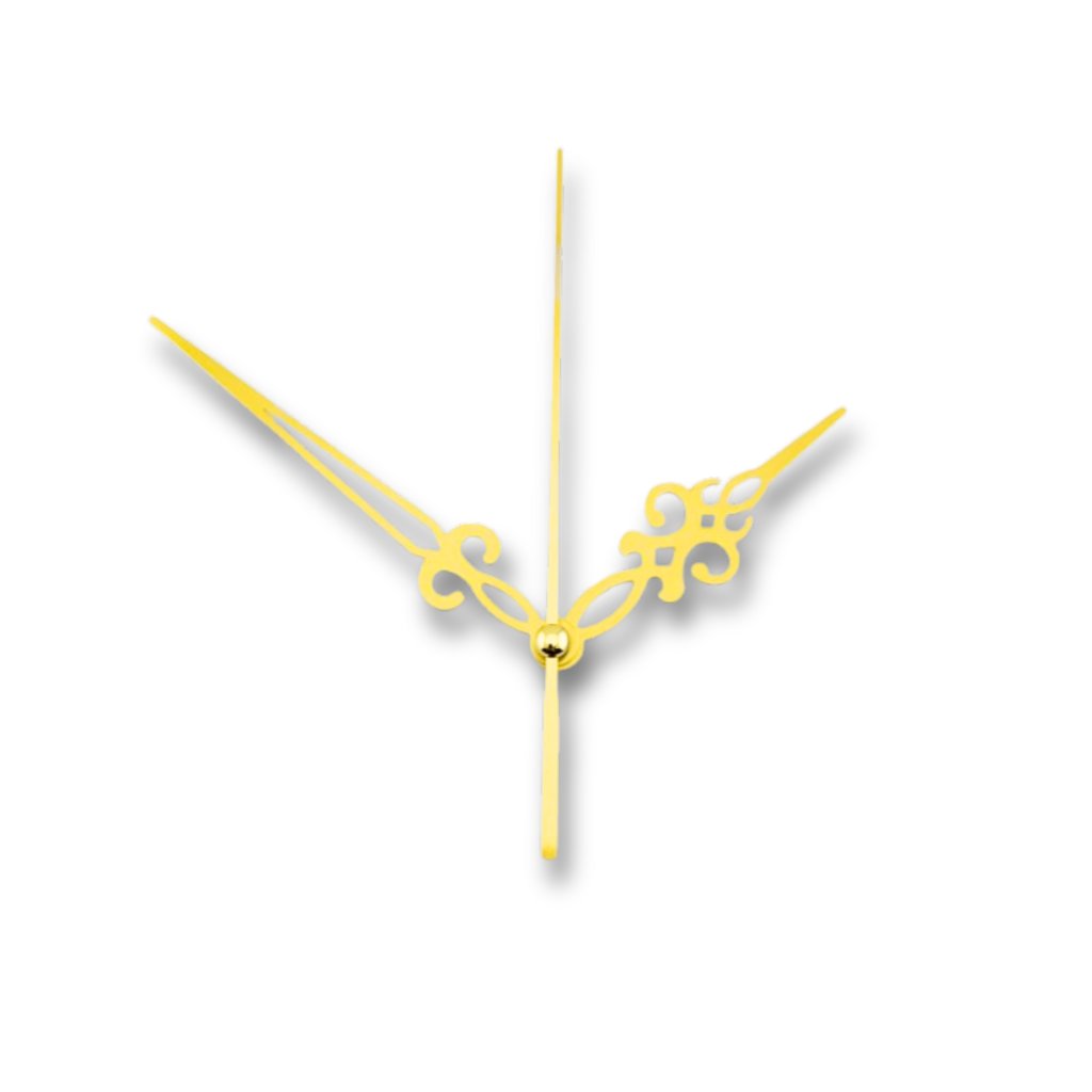 Hodinové ručičky Rustikální 5 s vteřinovkou 95/70 – zlaté jsou určené pro běžné bateriové hodinové strojky a perfektně se hodí k autorským ciferníkům z epoxidové pryskyřice, dřeva, mechu, betonu nebo překližky. Jemně zdobený rustikální tvar v kombinaci se zlatou barvou podtrhne charakter ručně vyráběných hodin a zvýrazní strukturu dřeva i hloubku pryskyřice.