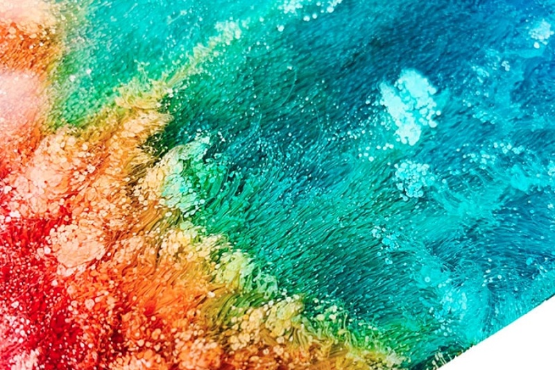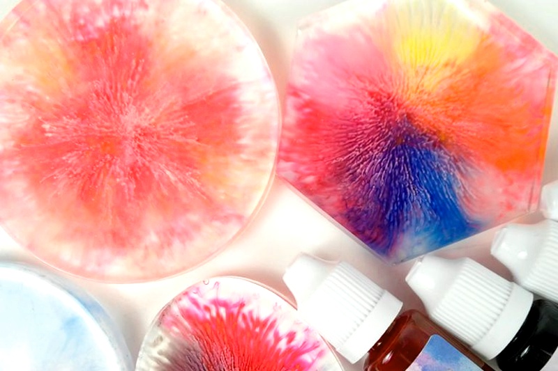 Silikonovou formu natřeme tenkou vrstvou separátoru. Formu usadíme do roviny a na pevný podklad. Rozmícháme pryskyřici a zalijeme formu. Na hladinu pryskyřice kapeme difuzní pigment v malých nebo větších kapkách. Pigment můžeme kapat vedle sebe, různé barvy, vytvoříme tak barevný přechod nebo kapeme pigment jedné barvy do kapky pigmentu na hladině. Zajímavé barevné efekty při "vkapávání" barev do sebe vznikají pokud mísíme kontrastní barvy - světlé do tmavé a obráceně nebo barvy nebo například žlutá a fialová (barvy jsou na spektru od sebe více vzdálené).