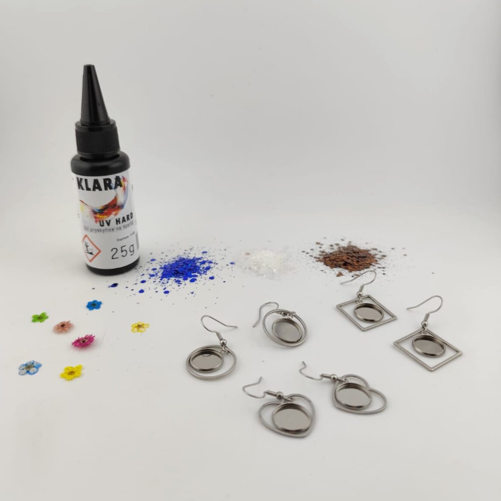 Kreativní sada pro zamilované – náušnice – tvary tak v jednom balíčku spojuje UV pryskyřici, květy, glitry a ocelová lůžka v romantických tvarech. Perfektní pro všechny, kteří chtějí tvořit šperky s příběhem a osobním dotykem.