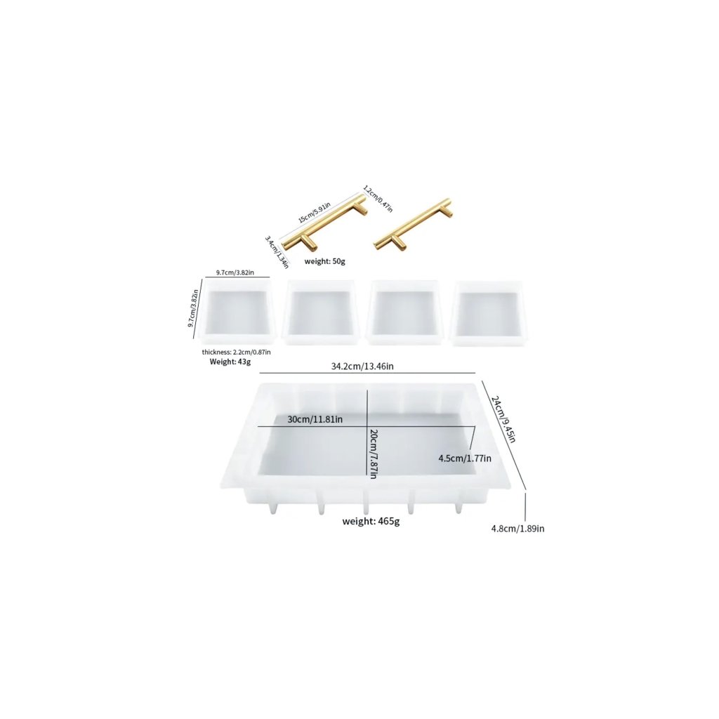 Balení: 1x forma podnos, 4x forma podtácek, 2x kovový úchyt zlatý