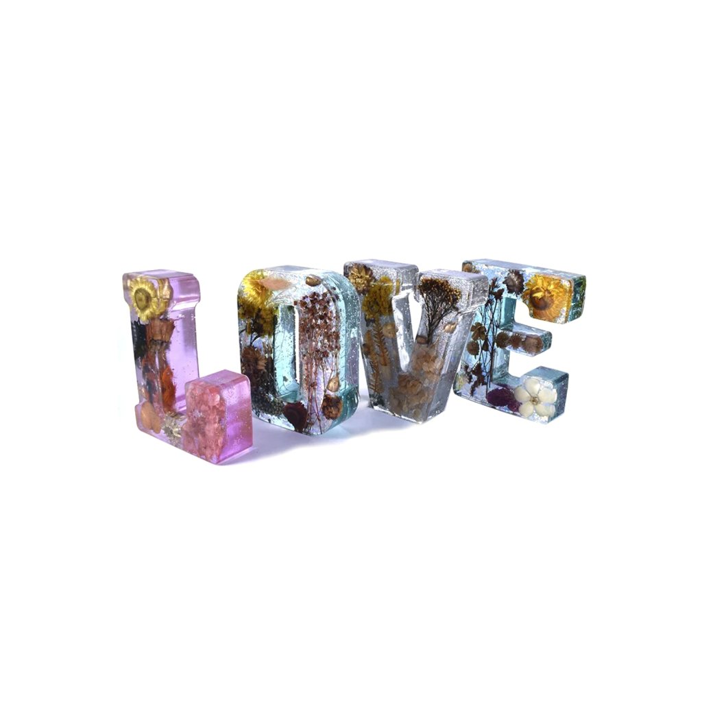 Silikonová forma pro výrobu dekorace z pryskyřice velké písmeno. Silikonové formy na pryskyřici jsou nedílnou součástí výtvarné práce s licí pryskyřicí. Pružný silikonový materiál drží tvar při odlévání a vytvrzený výrobek lze z formy snadno "vyloupnout". Silikonová forma je opakovaně použitelná. Pro odlévání velké dekorace vyberte pryskyřici pro lití vyšší vrstvy. Celkovou výšku dekorace lze též odlévat postupně v několika vrstvách po vytvrzení předchozí vrstvy. Postupné lití vrstev též využijeme pro dosažení rozmístění přidaných materiálů - dekorace dostává hloubku a perspektivu. Pro výrobu velké dekorace z pryskyřice používáme sušené květiny, hmyz, mech, glitry nebo metalický prášek.