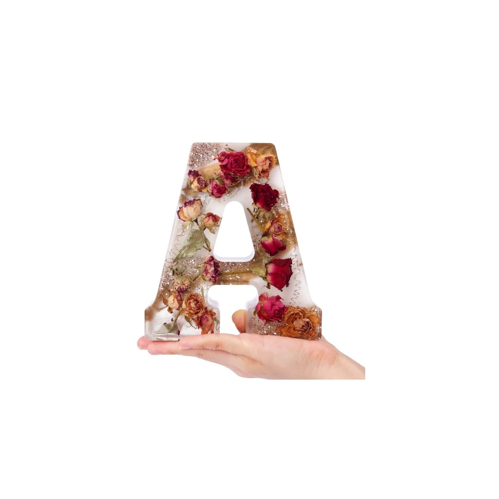 Silikonová forma pro výrobu dekorace z pryskyřice velké písmeno. Silikonové formy na pryskyřici jsou nedílnou součástí výtvarné práce s licí pryskyřicí. Pružný silikonový materiál drží tvar při odlévání a vytvrzený výrobek lze z formy snadno "vyloupnout". Silikonová forma je opakovaně použitelná. Pro odlévání velké dekorace vyberte pryskyřici pro lití vyšší vrstvy. Celkovou výšku dekorace lze též odlévat postupně v několika vrstvách po vytvrzení předchozí vrstvy. Postupné lití vrstev též využijeme pro dosažení rozmístění přidaných materiálů - dekorace dostává hloubku a perspektivu. Pro výrobu velké dekorace z pryskyřice používáme sušené květiny, hmyz, mech, glitry nebo metalický prášek.