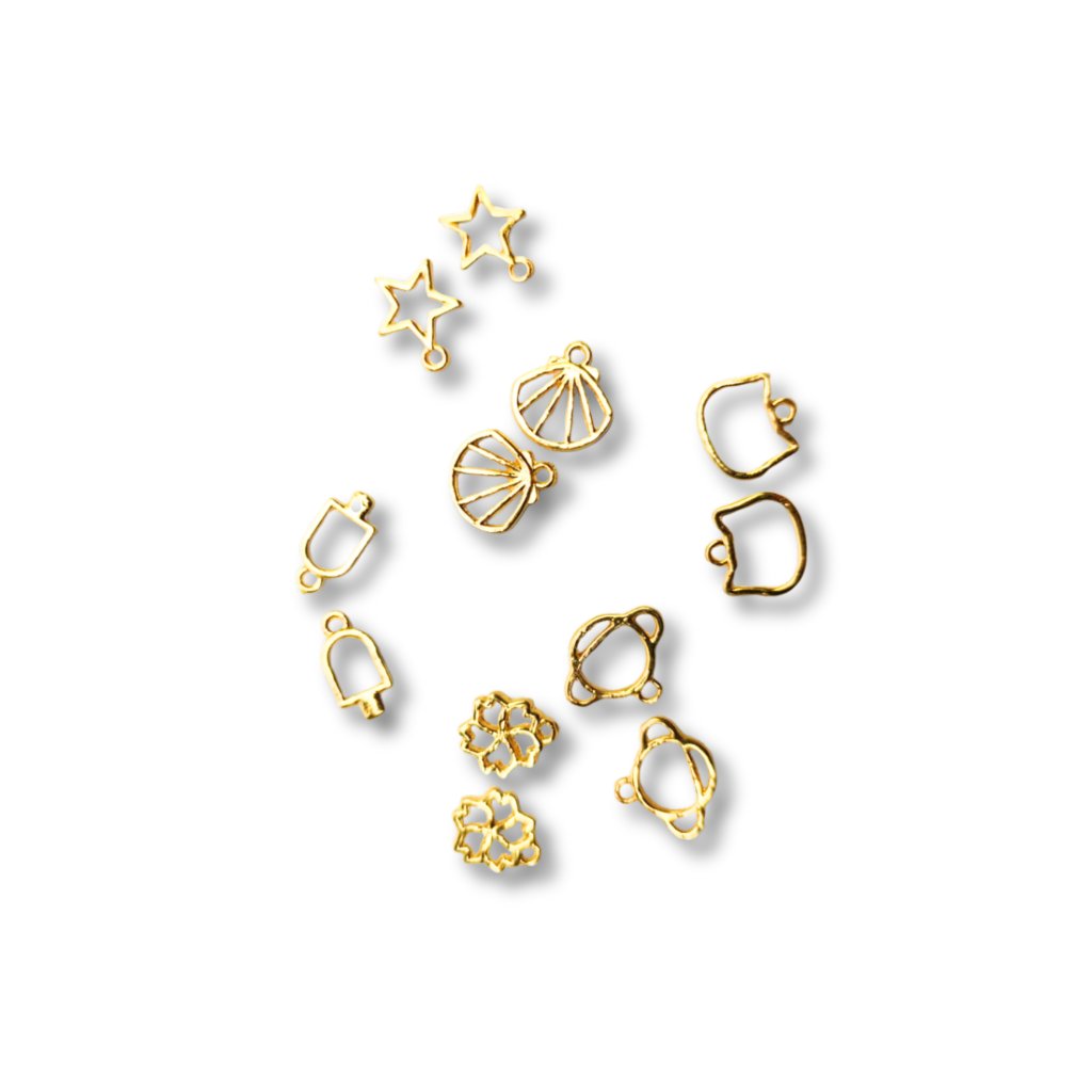 Tato sada obsahuje 6 párů lůžek v různých tvarech, díky kterým můžete vytvářet pestré a nápadité šperky. Kombinace motivů jako hvězda, zvonek, mušle, kočičí hlava, planeta a květina nabízí široké možnosti využití pro jemné, hravé i stylové výrobky.