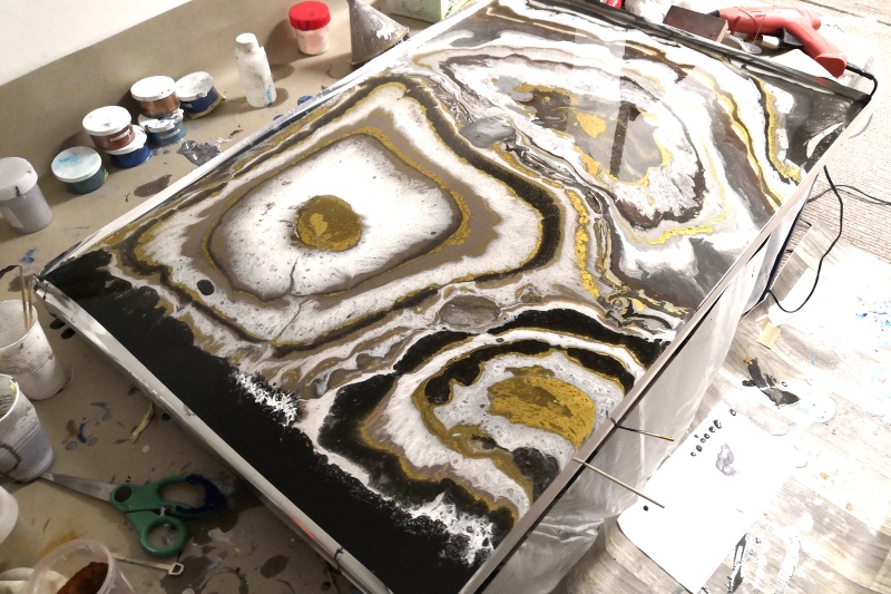 Postupným litím pryskyřice do několika kruhů, jsme se snažili dosáhnout výsledku, kterému se říká Geode Art. Toto uspořádání obrazců se snaží napodobit řez nerosty.