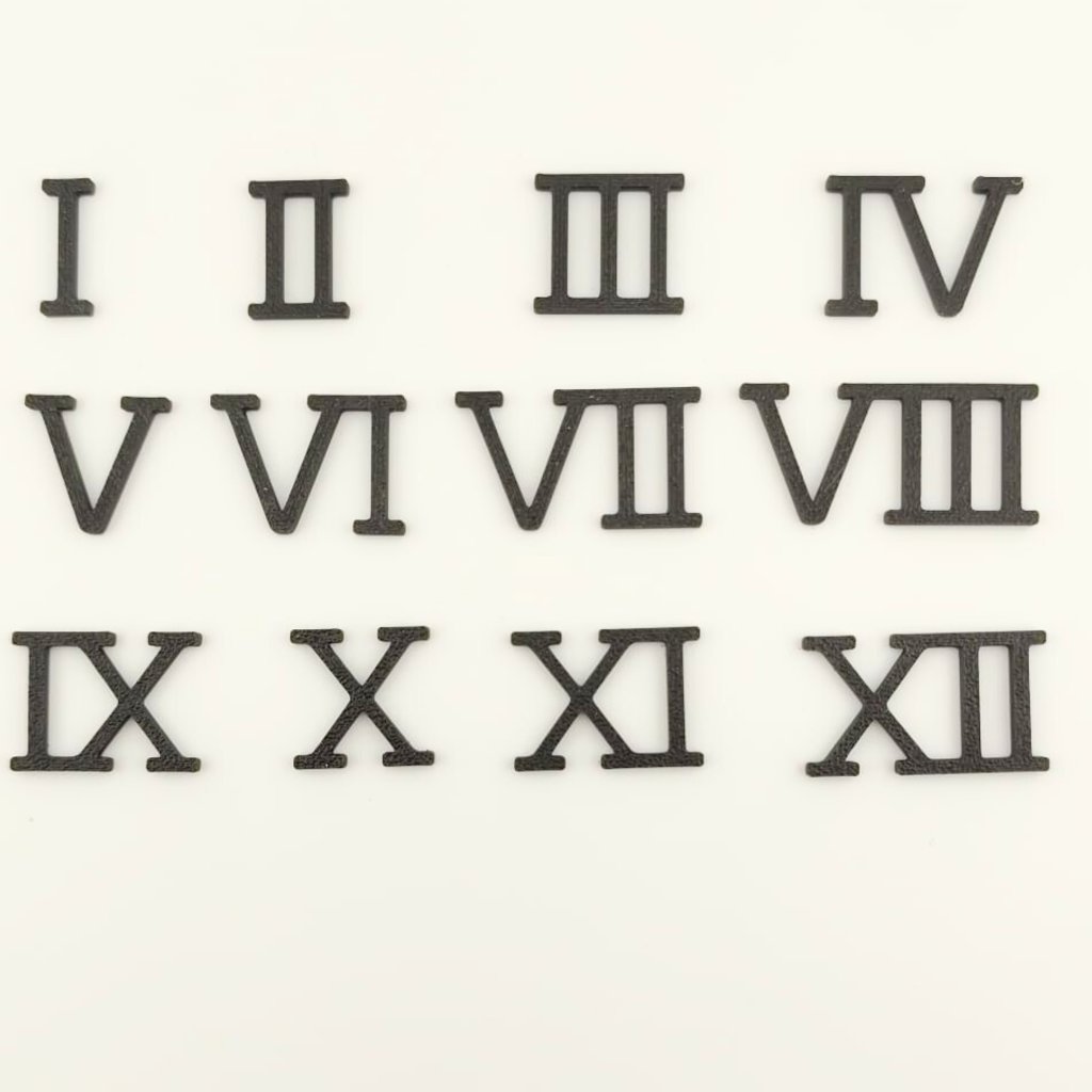 Zestaw plastikowych cyfr rzymskich w kolorze czarnym i o wysokości około 30 mm jest idealny do większości klasycznych zegarów ściennych. Czarne cyfry tworzą wyraźny kontrast na jasnych tłach, są dobrze czytelne i pasują zarówno do naturalnego, jak i bejcowanego drewna, tarcz epoksydowych, a także dekoracji z mchu.