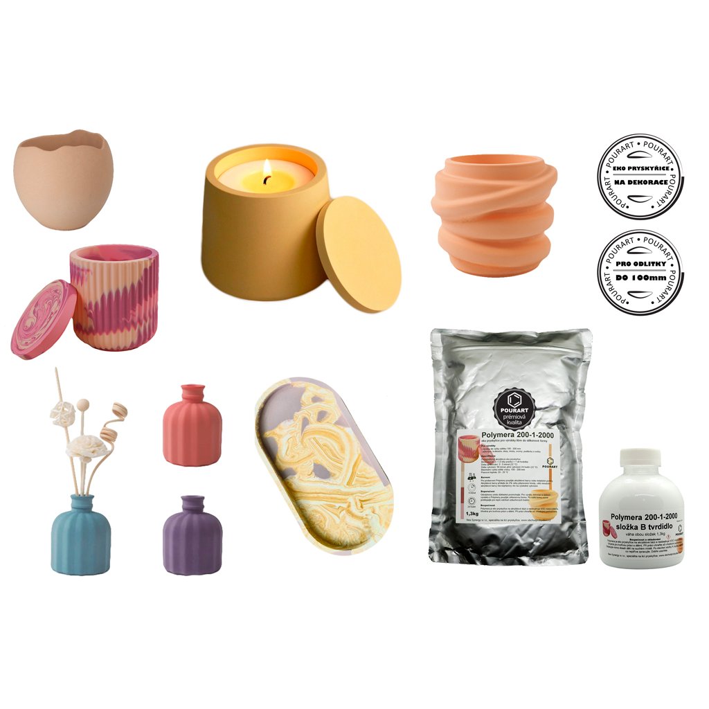 Eko pryskyřice Polymera 200-1-2000 na akrylátové bázi určená pro výroby dekorací litím do silikonové formy. Na rozdíl od epoxidových pryskyřic je možné s touto eko pryskyřicí pracovat i s dětmi. Z Polymery 200 je možné odlévat velké i malé dekorace a možnosti barvení jsou nekonečné. V základu je Polymera 200 po smíchání obou složek bílá. Mnoha dalších odstínů a barevných efektů dosáhneme přidáním akrylátové barvy nebo metalického prášku. Výrobky z Polymery 200 jsou pevné a odolávají nárazu.