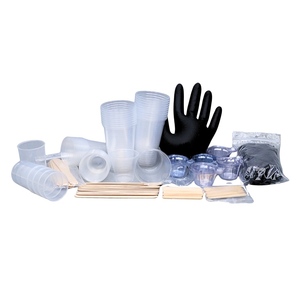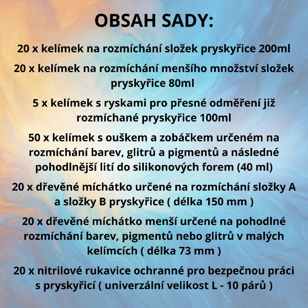 Doplňující velká sada pomůcek je zvýhodněné balení základních pomůcek pro všechny, kteří jsou již vybaveni základními pomůckami a potřebují si doplnit zásoby spotřebního materiálu pro práci s pryskyřicí jako jsou kelímky a míchátka.