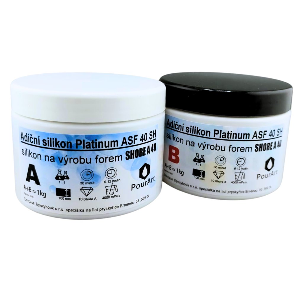 ASF 40SH je platinem (adičně) vytvrzovaný silikon určený k výrobě pevnějších forem s vysokou tvarovou stabilitou. Tvrdost kolem 40 Shore A znamená, že forma už je podstatně tužší než u měkčích silikonů – výborně drží rovinu, hrany a úhly, což se hodí u větších plochých odlitků nebo při častém používání.