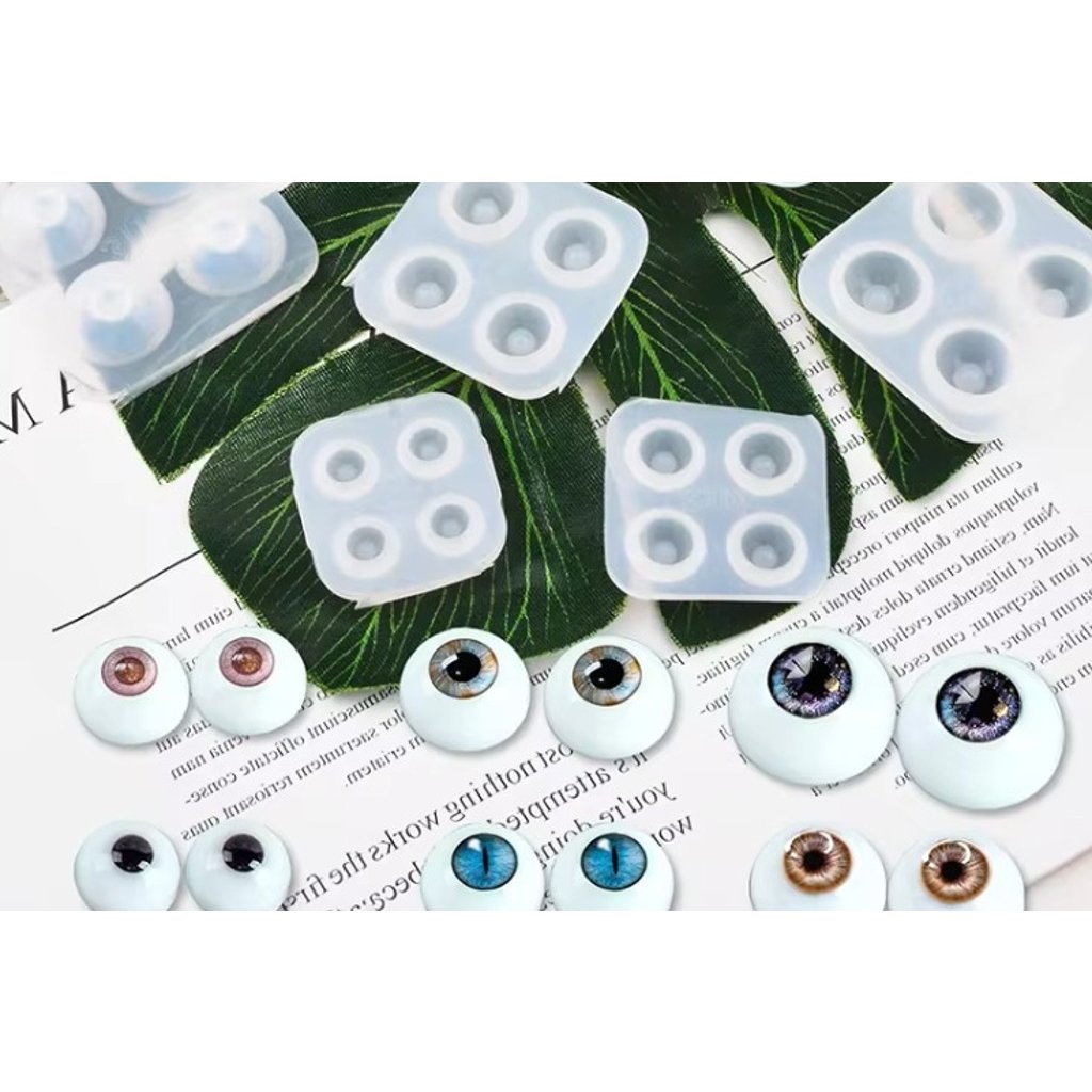 Silikonová forma pro výrobu očí. Nejprve dvousložkovou nebo UV pryskyřicí probarvenou na bílo odlijeme bulvy. Po vytvrzení do jamky lijeme malé množství pryskyřice s požadovaným probarvením tak, aby vnikl kopeček - čočka panenky.