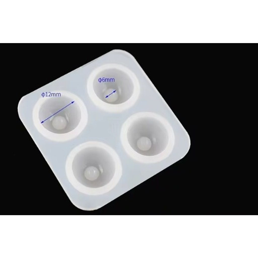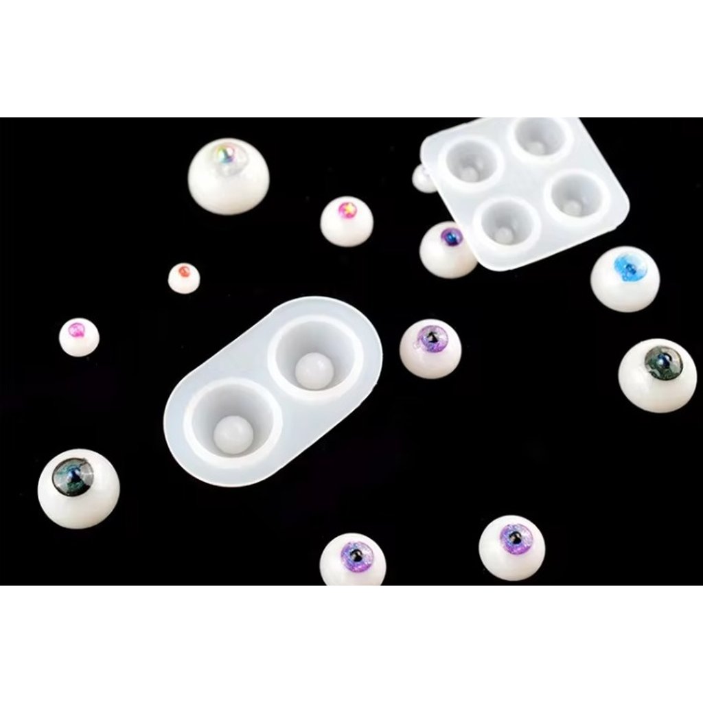 Silikonová forma pro výrobu očí. Nejprve dvousložkovou nebo UV pryskyřicí probarvenou na bílo odlijeme bulvy. Po vytvrzení do jamky lijeme malé množství pryskyřice s požadovaným probarvením tak, aby vnikl kopeček - čočka panenky.