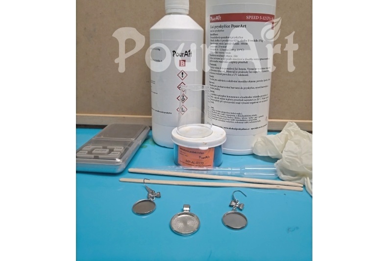 2. Dále budeme potřebovat váhu, kelímek na promíchání, špachtli na promíchání obou složek pryskyřice, modrý metalický prášek - pigment do pryskyřice a pipetu. Silikonová podložka je vhodná pro výrobu drobných šperků z pryskyřice. Vytvrzená pryskyřice se snadno ze silikonové podložky oloupe a snadno se dá omýt a zbytků barev.