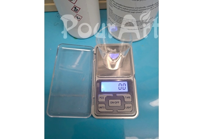 4. Na připravené digitální váze odvážíme nejprve složku A. K odvážení a míchání lze použít jednorázové plastové kelímky nebo silikonové kelímky, ze kterých opět zbytky vytvrzené pryskyřice snadno vyloupneme. Váhu vynulujeme tlačítkem TARE, váhu tedy tímto způsobem vynulujeme, a přidáme složku B.