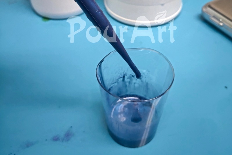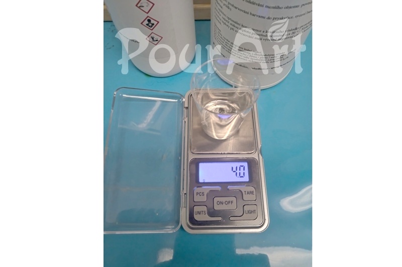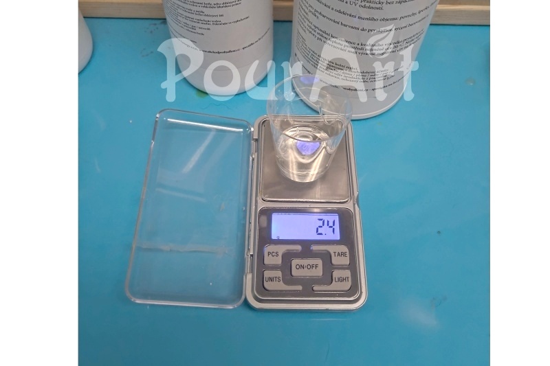 Odvážíme si do kelímku 100 g pryskyřice složku A. Kelímek si můžeme označit údajem, kolik gramů v kelímku máme. Lze takto připravit i více kelímků. Do kelímku, který obsahuje složku A začneme přidávat pigment. Doporučujeme začínat od malého množství, až nám barva a sytost budou vyhovovat. Samozřejmě důkladně promícháme.