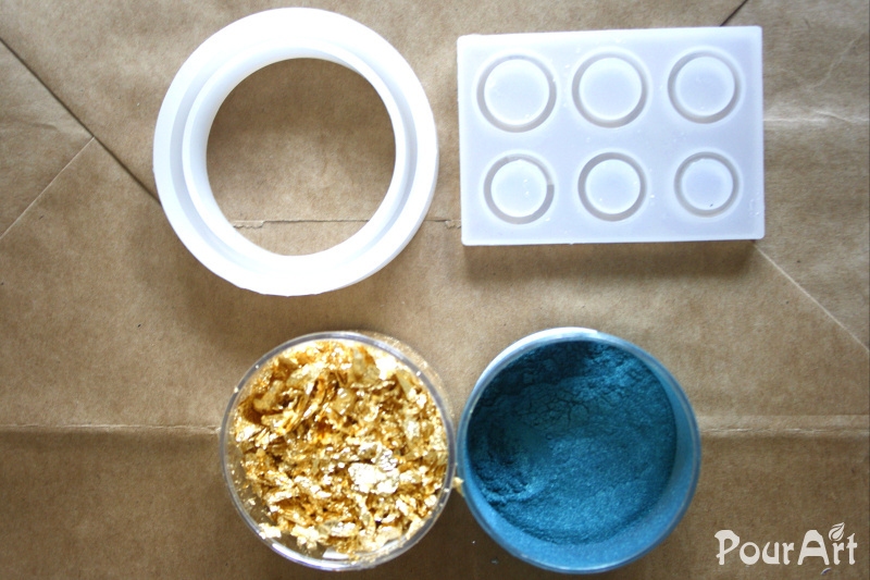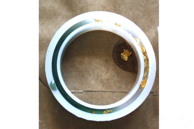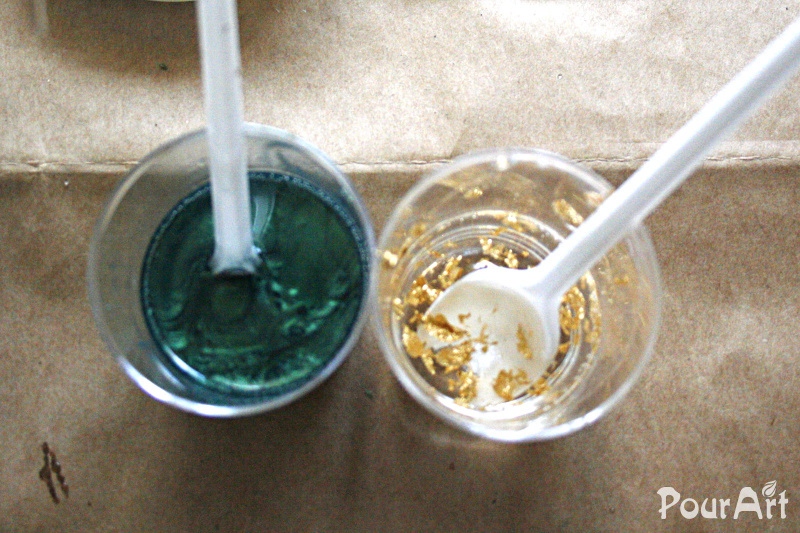 - ve dvou kelímcích si nejprve smícháme pryskyřici s metalickým práškem a ve druhém se zlatou folii, necháme minutu odstát aby vzniklé bubliny vyprchaly na povrch