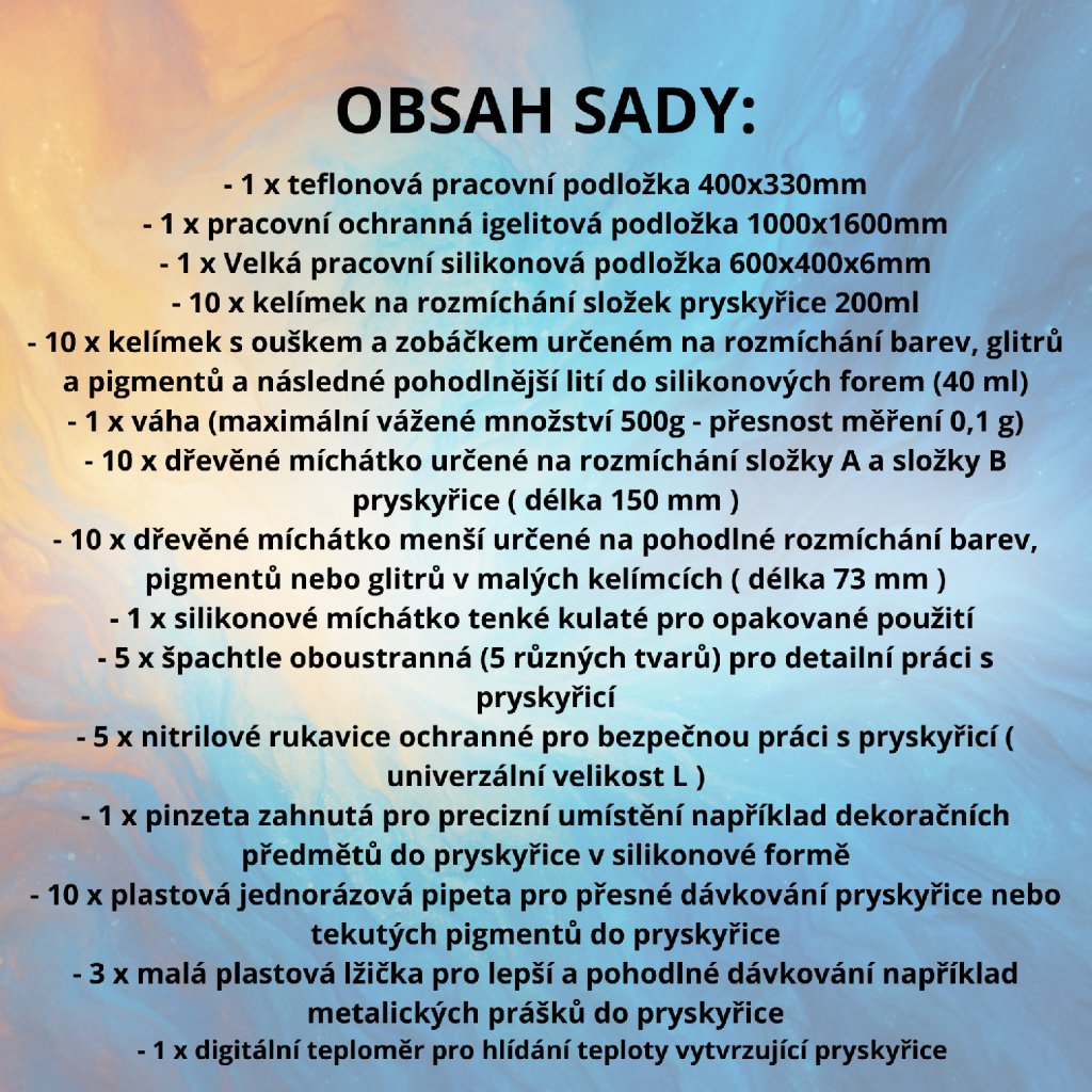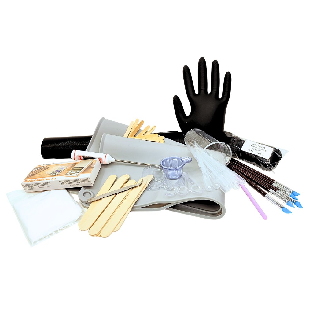 Startovací sada pomůcek pro práci s pryskyřicí zaměřená na potřeby při výrobě šperků a přívěsků. Tato sada je především určena pro začínající. Proto obsahuje základní nezbytné pomůcky pro práci s pryskyřicí v malých objemech, jako je přesná váha, několik druhů malých kelímků a míchátek a pár dalších nezbytných pomůcek které usnadní, ulehčí nebo umožní práci na malých předmětech kterými šperky a přívěsky bezesporu jsou.