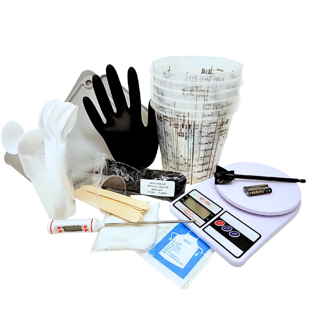 Startovací sada pomůcek pro práci s pryskyřicí zaměřená na potřeby při výrobě velkých dekorací. Tato sada je především určena pro začínající. Proto obsahuje základní nezbytné pomůcky pro práci s pryskyřicí ve větších objemech, jako je přesná váha, několik druhů kelímků a míchátek a pár dalších nezbytných pomůcek které usnadní, ulehčí nebo umožní práci na velkých dekoracích a při práci s většími objemy pryskyřice. Výborně se hodí jako základní sada pomůcek při tvorbě větších předmětů a dekorací od servírovacích prkének až po výrobu stolků, stolů a jiných velkých výrobků z pryskyřice.