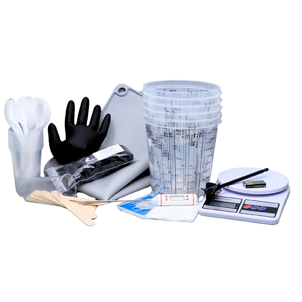 Startovací sada pomůcek pro práci s pryskyřicí zaměřená na potřeby při výrobě velkých dekorací. Tato sada je především určena pro začínající. Proto obsahuje základní nezbytné pomůcky pro práci s pryskyřicí ve větších objemech, jako je přesná váha, několik druhů kelímků a míchátek a pár dalších nezbytných pomůcek které usnadní, ulehčí nebo umožní práci na velkých dekoracích a při práci s většími objemy pryskyřice. Výborně se hodí jako základní sada pomůcek při tvorbě větších předmětů a dekorací od servírovacích prkének až po výrobu stolků, stolů a jiných velkých výrobků z pryskyřice.
