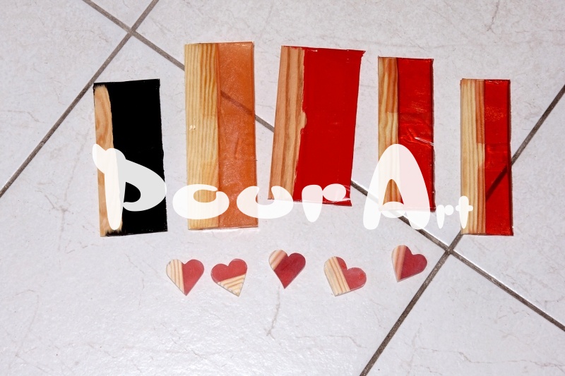 Můžete samozřejmě použít i jiné barvy do pryskyřice a a klidně i doplnit jemnými glitry. Různé kombinace můžete vidět i na přiložené fotografii. Bublinky jsem z pryskyřice vyhnal teplem plynového hořáku. Nechal 48 hodin vytvrdit a poté odformoval. Mezitím jsem z papíru vytvořil šablonu ve tvaru srdce. Lihovou fixou obkreslil srdce na odlitek a lupénkovou pilkou následně vyřízl jednotlivá srdce a dopiloval a dobrousil ze všech stran do požadovaného tvaru. Navrtal dírky pro vlepení oček (hotová očka nebo je lze vytvořit z bižuterního drátu) a vlepili je epoxidem.